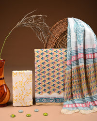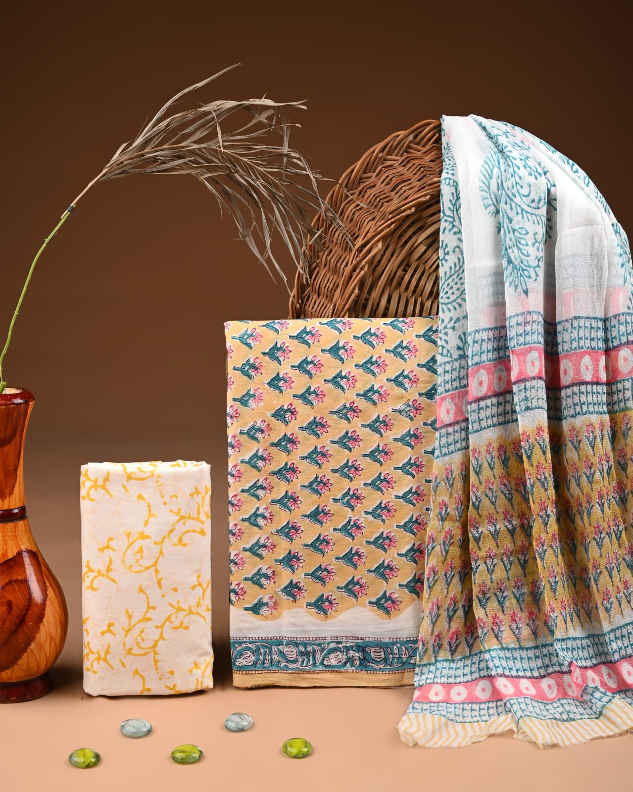Craftsmanship: This ensemble showcases the traditional Bagru hand block printing, a 400-year-old art form from Bagru, Rajasthan. Artisans use hand-carved wooden blocks and natural dyes to create intricate patterns, reflecting the rich cultural heritage of the region.