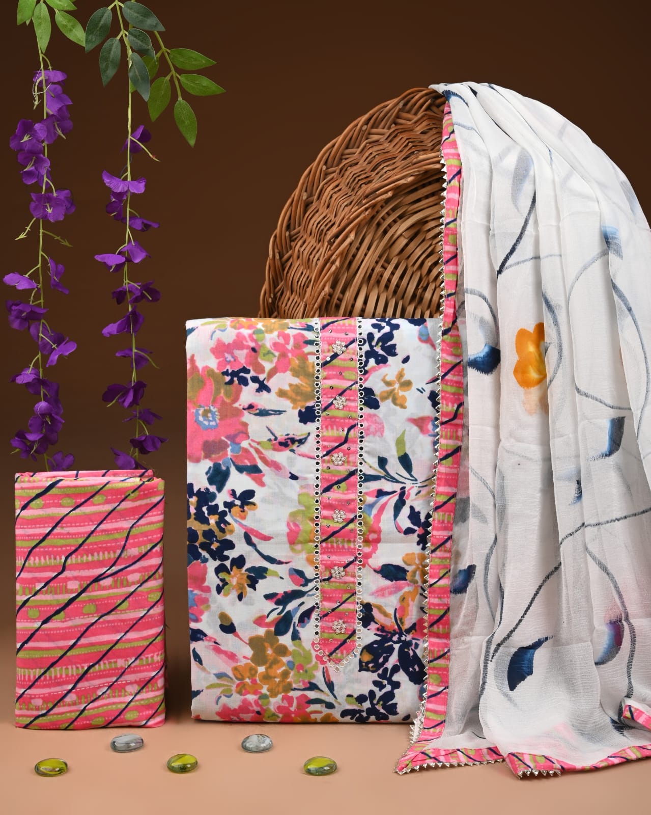 Timeless Cotton Suit Set with Multicolor Neck & Zari Chiffon Dupatta