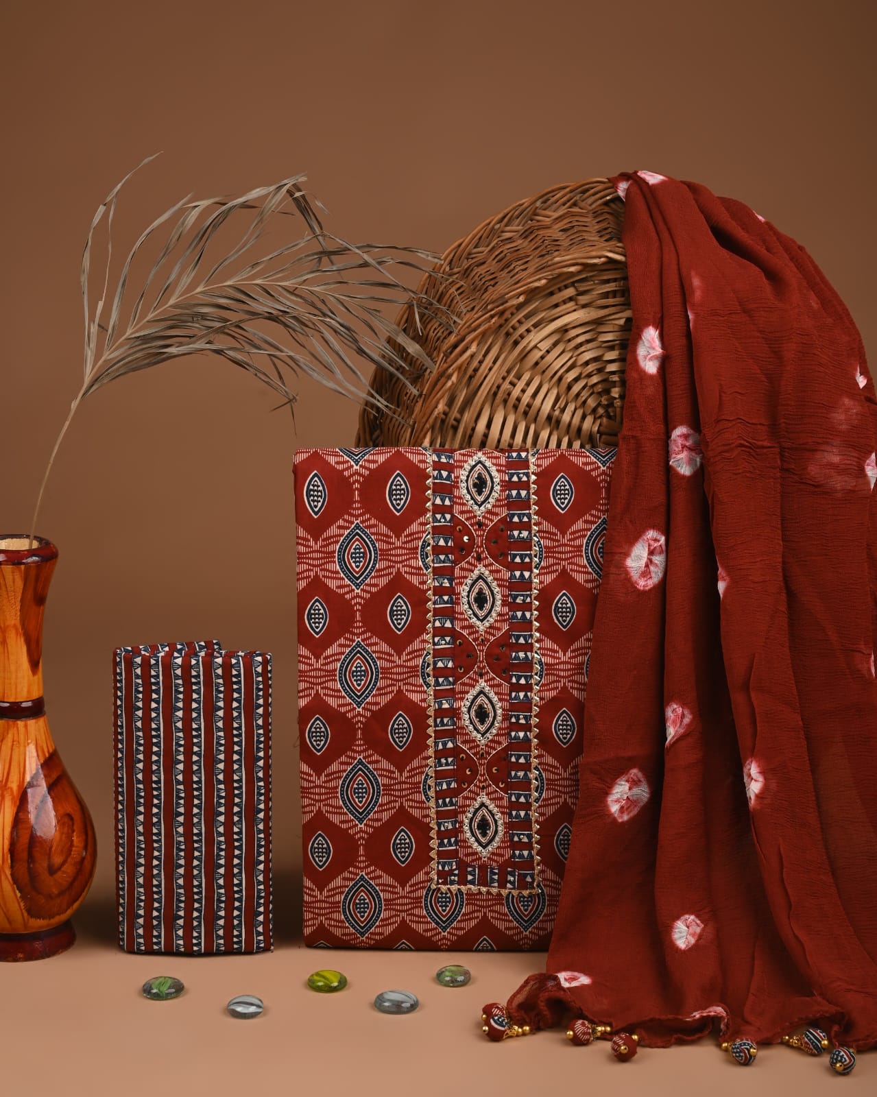Timeless Cotton Suit Set with Multicolor Neck & Zari Chiffon Dupatta