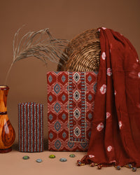 Premium Cotton Suit Set with Multicolor Neck & Zari Chiffon Dupatta (BCTCOTCFG53)