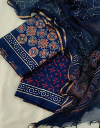 This ensemble features the traditional Bagru hand block printing on pure cotton, combined with a Kota Doria dupatta. Kota Doria is a lightweight, semi-transparent fabric renowned for its unique square check pattern, known as 'khat'. Originating from Kota, Rajasthan, this fabric is woven using a blend of cotton and silk threads, offering a delicate yet durable texture. The 'khat' pattern is achieved through a meticulous handloom weaving process, resulting in a fabric that is both breathable and elegant.