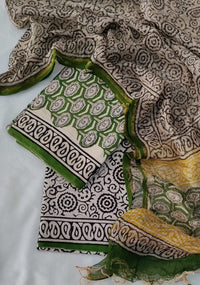 This ensemble features the traditional Bagru hand block printing on pure cotton, combined with a Kota Doria dupatta. Kota Doria is a lightweight, semi-transparent fabric renowned for its unique square check pattern, known as 'khat'. Originating from Kota, Rajasthan, this fabric is woven using a blend of cotton and silk threads, offering a delicate yet durable texture. The 'khat' pattern is achieved through a meticulous handloom weaving process, resulting in a fabric that is both breathable and elegant.