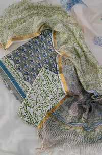 This ensemble features the traditional Bagru hand block printing on pure cotton, combined with a Kota Doria dupatta. Kota Doria is a lightweight, semi-transparent fabric renowned for its unique square check pattern, known as 'khat'. Originating from Kota, Rajasthan, this fabric is woven using a blend of cotton and silk threads, offering a delicate yet durable texture. The 'khat' pattern is achieved through a meticulous handloom weaving process, resulting in a fabric that is both breathable and elegant.